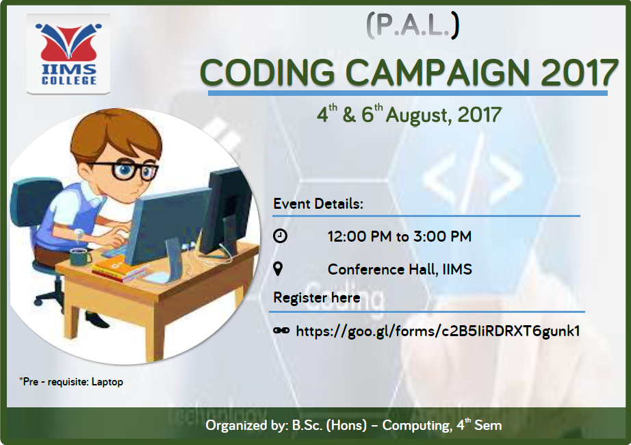 Dhobidhara, Kathmandu, NepalCoding Campaign being organized by B. Sc. Computing 4th sem to ensure efficient front end development skills. Its a 2 day event, being conducted on 4th and 6th of August, 2017 (Friday and Sunday).